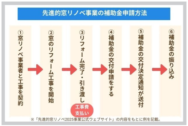 - 先進的窓リノベ事業で補助金を申請する際、主に次の手順で行います。(例、2025年度)