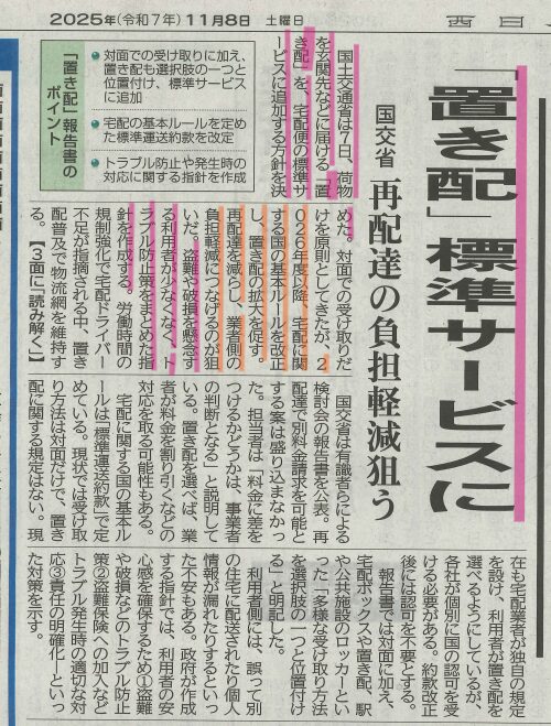 最近、国土交通省が、宅配便における「置き配(玄関先や宅配ボックス等に荷物を置く受け取り方式)」を 標準サービス化 する方向で基本ルールの見直しを検討していることが報じられています。