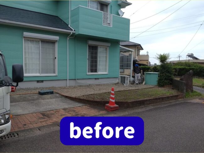 駐車スペースを広くするために花壇や砂利を撤去・鋤取り後、土間コンクリート打設とカーポートの取付を行いました。