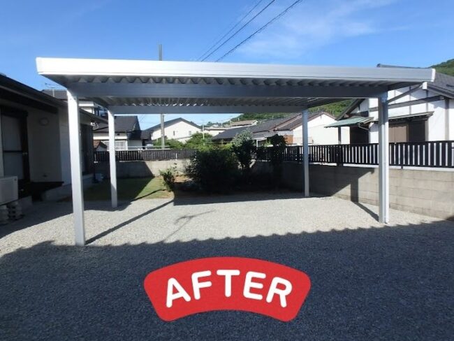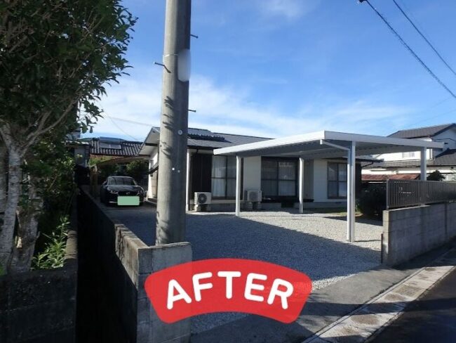 カーポート設置後に敷地内の砂利を敷き均し、すべての施工が完了です!
