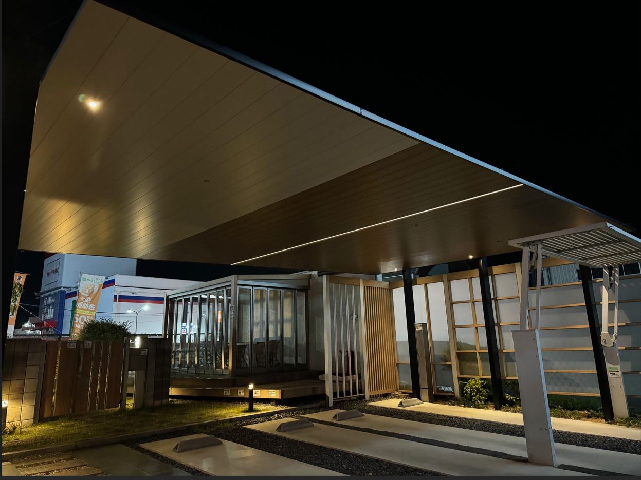 屋根材にビルトインされたフラットな納まりで、ファサード空間をスタイリッシュに演出します。