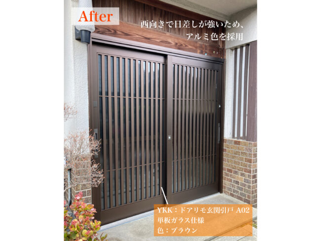 今回は「使いやすさ」と「安心感」を重視し、軽量なアルミ引戸をご提案しました。開け閉めの負担が軽減され、鍵の使い勝手も向上しています。さらに、気にされていた段差も可能な限り低く抑えることで、将来的にも安心してお使いいただける玄関に仕上がりました。ご満足いただけたことに加え、追加で窓リフォームのご依頼もいただき、大変嬉しく思います。