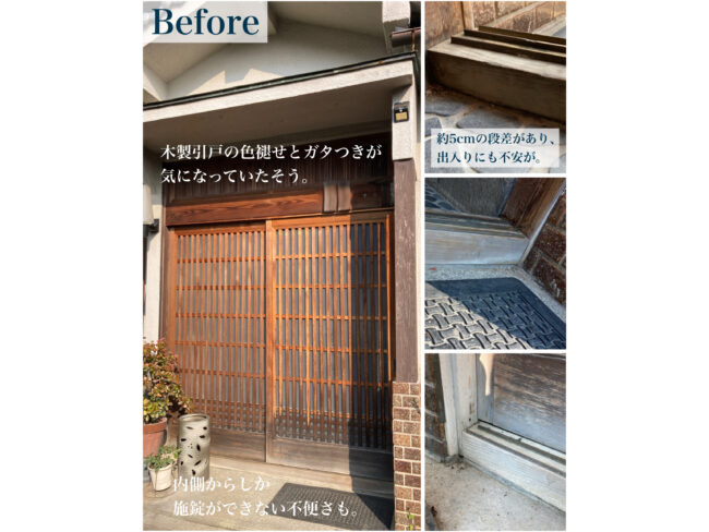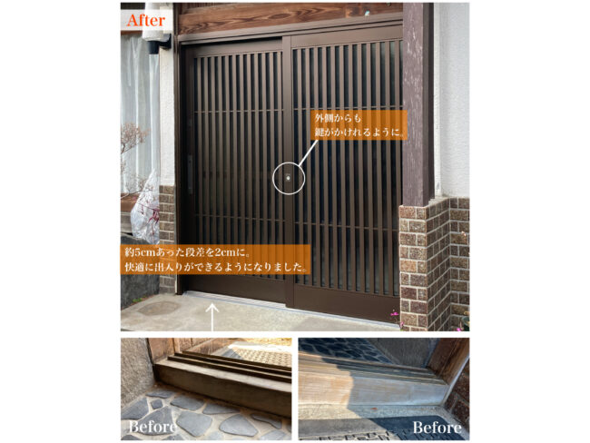 引戸が軽くなり開け閉めがとても楽になりました。鍵も使いやすくなって安心感があります。段差も低くなり、出入りの不安が減って快適に使えています。