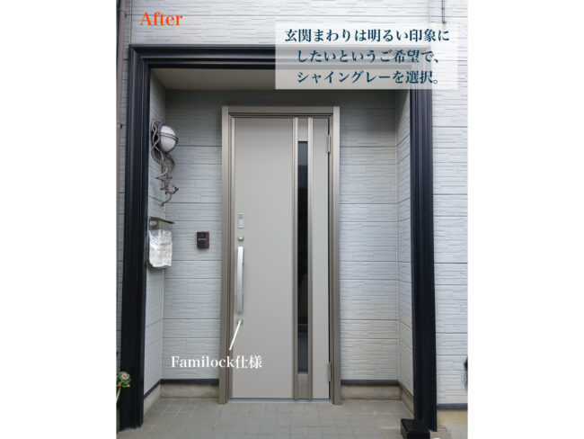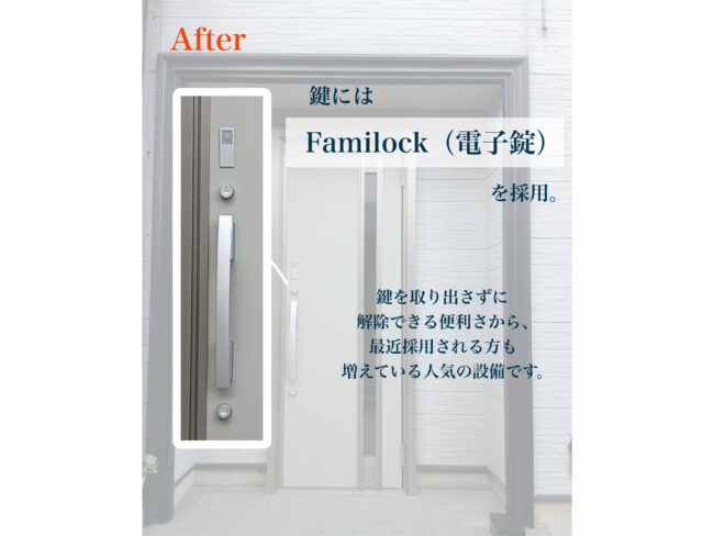 また、鍵はFamilock(電子錠)にしました。鍵を出さずに開け閉めできるのでとても便利で、毎日の出入りが楽になりました。玄関の使い勝手が良くなり、とても満足しています。