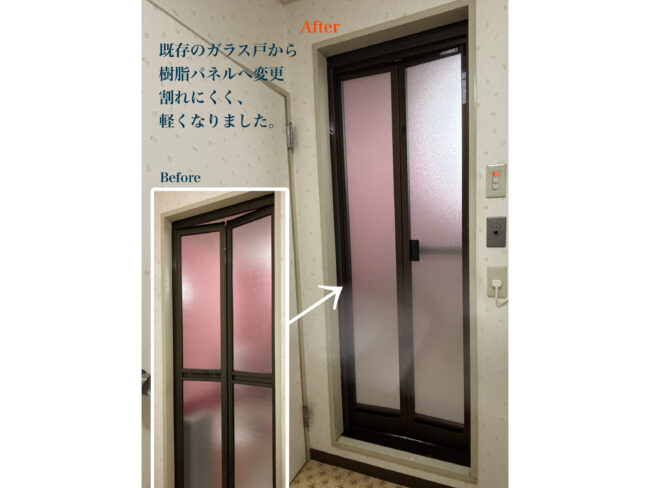 樹脂パネルの折戸は軽く安全性も高く、交換後は開閉がとてもスムーズになりました。元の扉に近い色で違和感なく仕上がり、特に気にされていた足元の汚れも部材を追加して枠が隠れるよう工夫しています。