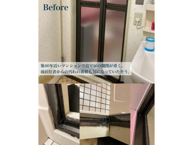 築年数のある浴室で扉の開閉が重く、汚れも気になるとのことで、スペースに干渉しにくい折戸タイプをご提案しました。