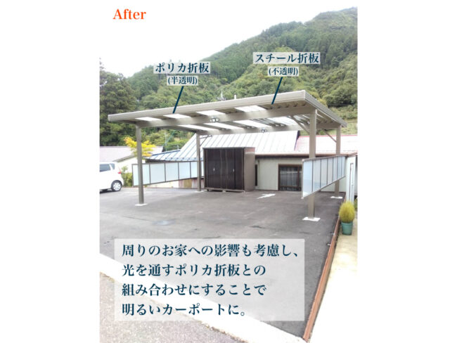 また、屋根を全面折板にすると暗くなりやすいため、明るさと周辺環境への配慮を考え、光を通すポリカ折板との組み合わせに。さらに、後日揺れ防止と目隠しを兼ねたサイドパネルを追加施工しました。季節を問わず快適に使えることを重視した施工です。