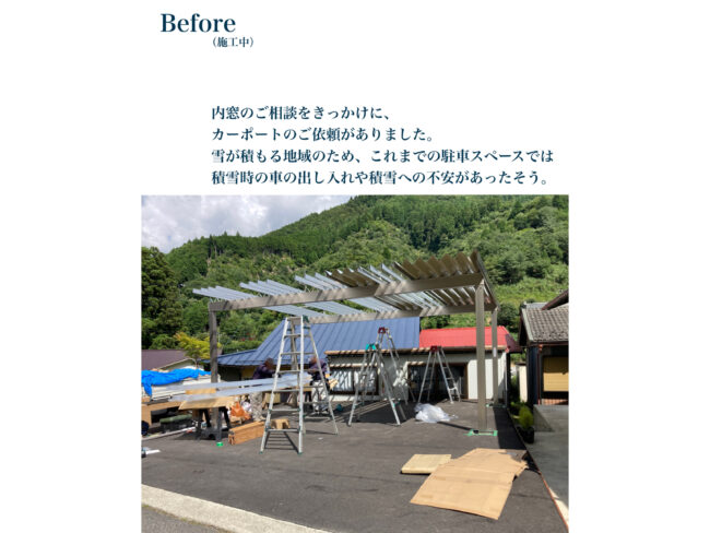 内窓の相談をきっかけに気になっていたカーポートの相談もさせていただき設置にいたりました。積雪時の車の出し入れに不安がありましたが、夏の暑さや冬の寒さでもこれで安心です。ありがとうございました。