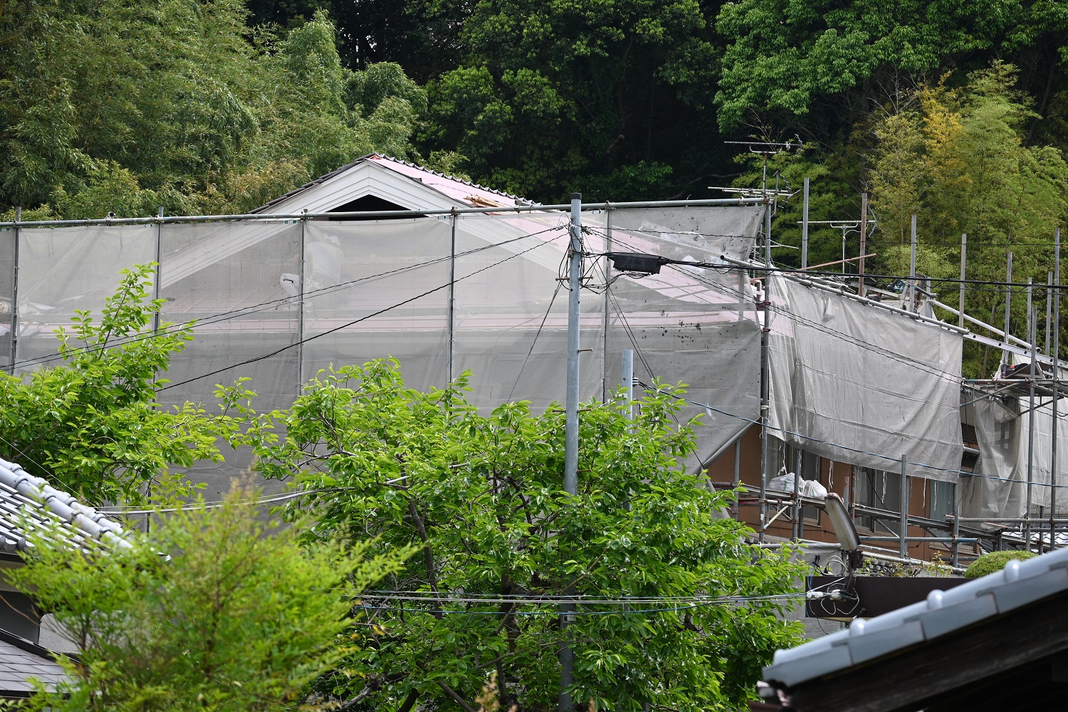 本日は、屋根(瓦撤去後)下地にルーフィング(防水シート)貼りです。