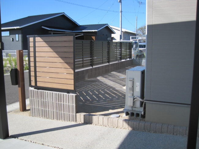 子育て世代のお客様よりご相談いただき、木目調の目隠しフェンスが温もりとプライベート空間を演出してくれる新築外構が完成しました。