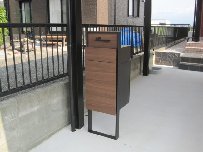 思い切って3段の前庭、カーポート、階段状のアプローチ等を撤去し、全て土間コンクリートの駐車スペースに。最大4台駐車できるようになりました。玄関ポーチから続くアプローチは300角タイルの階段に。カーポートは2台用の間口が広いタイプの折板屋根カーポート。カーポートの柱前に宅配ポスト付きの機能門柱を設置し、雨の日でも郵便物が楽に取り出せるようにしました。