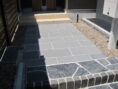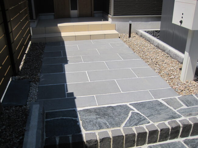 境界側と玄関側の目隠しフェンスも木目調にしました。全体的にエクステリア商材は黒と木目調で統一しています。