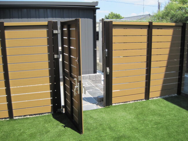 ・目隠しフェンス工事②:Eウッドスタイルフェンス、門扉 H1800 板幅120 隙間10㎜