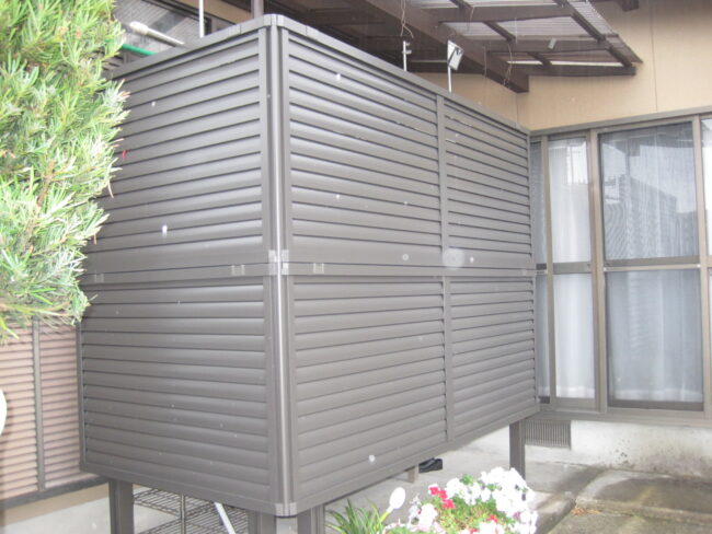 家のそばに大きな幹線道路があり、お洗濯物が丸見えで困っているとご相談を頂きました。完全目隠しで、アルミ部材の強度が強いものをご希望でしたので、フェンスABのYL3型の多段柱仕様をご提案、施工させて頂きました。