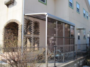 建物の入隅にありがちなデッドスペースにテラス屋根を設置し、自転車置き場に。