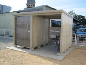 ・メリット:防犯性が非常に高く、雨風を完全にシャットアウトできます。空気入れやヘルメットなども一緒に保管できます。