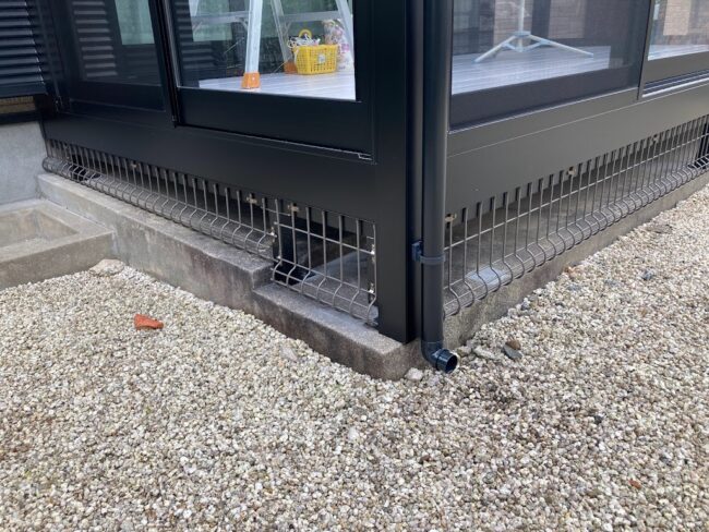 サンルーム下には「床下囲い部材」のメッシュを取付、風通しを確保しつつ小さなお子様が潜り込んだり、犬や猫などが入らないように防止出来ます。