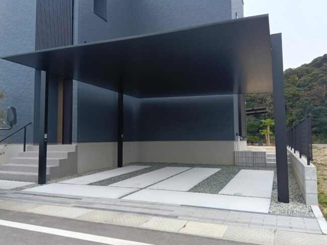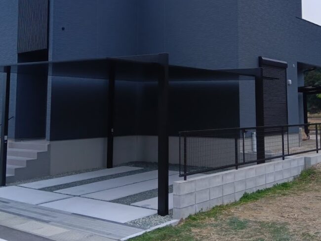 柱・梁・屋根材ともにブラック一色で統一され、高級感がありシャープな印象です。