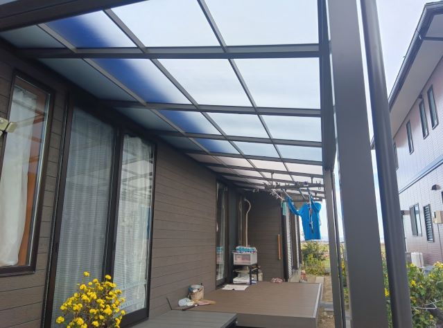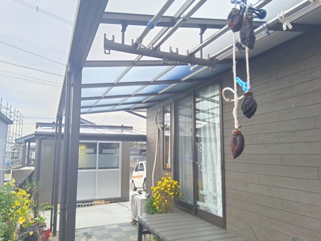 今まで日よけで対応されていましたが、今回テラス屋根を設置し、しっかりした屋根が出来ましたので、雨などを気にせず作業が出来ます。
