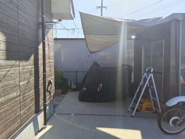 今まで日よけで対応されていましたが、今回テラス屋根を設置し、しっかりした屋根が出来ましたので、雨などを気にせず作業が出来ます。