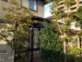 「シュエット」は、アルミに木目調を施したテラスです。カラーもクリエダーク色で木々とも調和し、日除けを広げた感じも雰囲気が良い仕上がりになりました。